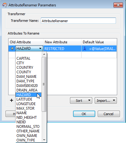 Connect the transformer to one or more feature types and click the Transformer properties button. Three columns (Old Attribute, New Attribute, and Default Value) are displayed in the Parameters dialog: