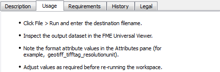 This parameter allows you to enter a description. The description is particularly important when you are using the workspace via an FME Server – because it provides a mechanism for a web page to describe what the process is intended to carry out.