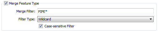 For example, if you have a "PIPE145" feature type in your workspace as an input feature type, and you know there are many other feature types that have some sort of PIPE designation, open the Feature Type dialog, check the Merge Feature Type checkbox, and enter a pattern that any incoming feature type would have to match in order to be considered the same as PIPE145. So, you could enter: