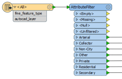 In this beginning of a workspace, a CAD file containing road data is read, and the features divided into separate streams for further processing based on the autocad_layer attribute value.