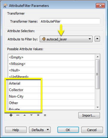 Once connected, the AttributeFilter lets you select an attribute to filter incoming features by. By default, Empty, Missing, Null, and Unfiltered outputs are provided, and you can specify additional values to filter by either entering them manually or importing values from an existing dataset.
