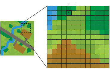 A raster geometry is a grid of values organized into rows and columns. Each row and column intersection in the grid is called a cell or pixel.