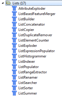 Another use of the ListExploder is to make copies of the feature for each list element, and then these copies may be sorted by some criteria (such as length or area), and lastly the elements run through a DuplicateRemover transformer to select only the largest or smallest feature that was originally an element of a list.