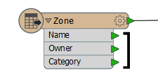 Individual elements of a reader or writer feature type. In this example, the feature type is Zone and the attributes are Name, Owner, and Category.