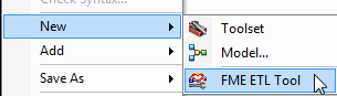 • Right click on the new toolbox and choose New > FME ETL Tool from the command menu.