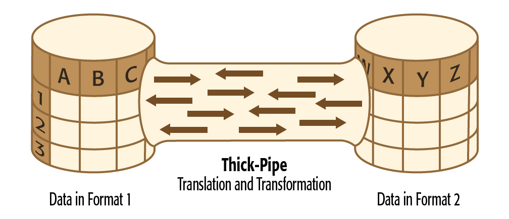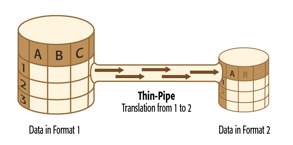 Traditionally the software used to translate data to a different format had limited capabilities. Most of the data would be forced through a limited data model causing much of the meaning to be lost in translation. We call this a “thin-pipe translation”.