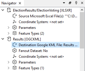 are output: two have Votes attribute equal to candidate, and one has Votes attribute equal to write_in. If Destination Fanout Directory is C:\ and Fanout Expression is Votes (or @Value(Votes) in the Text Editor), you will end up with datasets in two folders: c:\candidate\ and c:\write_in\. The output filenames will be based on the output feature types specified in the workspace.
