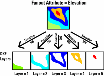 A feature type fanout writes a single dataset but divides the data into a number of layers/themes/feature types/objects/classes in that dataset. In this example, data is divided into a number of layers on the basis of an elevation attribute.