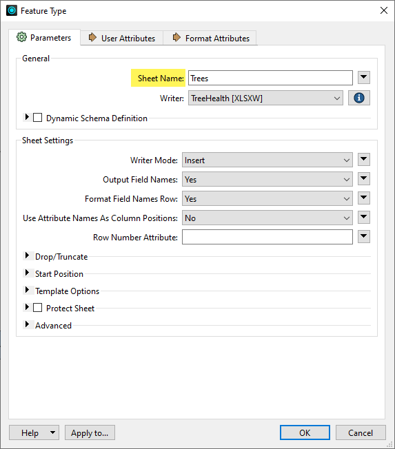 A Feature Type simply represents a layer of data. Because this is format-specific, FME uses the generic term Feature Type. The Name parameter label might be Feature Class, Layer, Sheet, Table, or whatever terminology is specific to the format of data you are writing. For example, an Excel feature type is a Sheet Name: