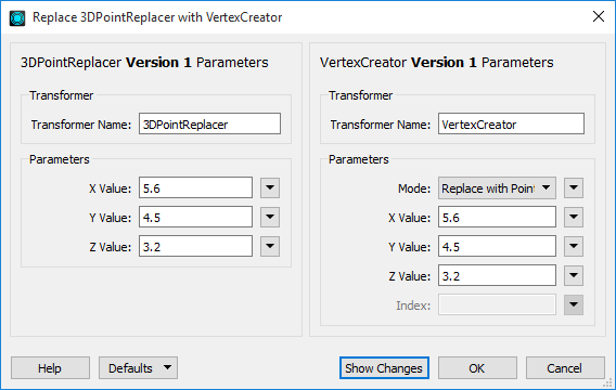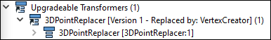 In some cases, a transformer from a previous version of FME Form may have been deprecated, either because it was renamed, its function was merged into an existing transformer, or a new transformer was created that merges the functions of multiple transformers. Deprecated transformers also appear in the Navigator under Upgradeable Transformers, but are distinguished by indicating the transformer it is 'Replaced by'. In this example, the 3DPointReplacer is replaced by the VertexCreator: