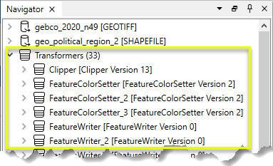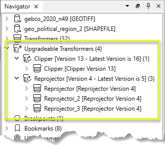 Transformers whose version is earlier than the latest version available appear in the Navigator, under Upgradeable Transformers. The current version, and the latest version available, both display: