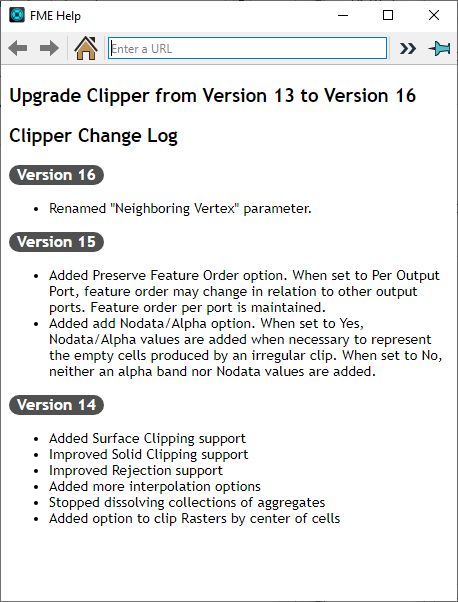 - Detailed Version Changes: Click Show Changes. The FME Help viewer displays detailed information about how the transformer has changed between versions.