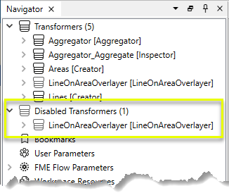 The Transformers parameter in the Navigator shows the disabled transformers in the main transformer list and adds a new Disabled Transformers object: