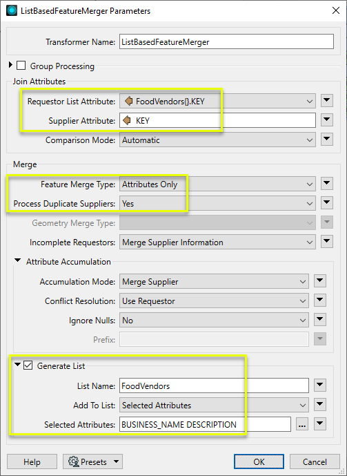 And finally, we enable Generate List, to create new list attributes on the output features. It will contain all matching Business names and descriptions, via Selected Attributes. Note the list name entered - FoodVendors - is the same as the existing list name. This will result in the new attributes being added to (and expanding) the current list. If we entered a different name here, a new list attribute would be created.