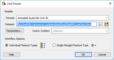 Defining a URL dataset to be read is as simple as entering the URL into the Dataset field within any of FME’s dataset selection tools. After reading, the data will be downloaded and used just as if it were a normal dataset.