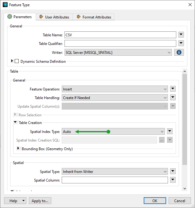 For example, when writing to a SQL Server database there is a feature type parameter that defines the spatial index to create.