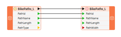 In FME Workbench, attribute mapping is sometimes implied rather than visualized, and no connecting arrow is shown. The color of the port indicates the connection status. Green indicates a connected attribute. Yellow indicates a source attribute unconnected to a destination, and red indicates a destination attribute that is not connected to a source.