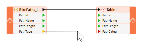 A new connection from PathType to PathCateg is being made. The other attributes have matching destinations so they are connected automatically (implied connection). Note the green, yellow, and red color coding showing which attributes have been connected.