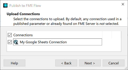 If your workspace contains any database or web connections, use the Upload Connections dialog to specify the connections you want to upload. Unless previously uploaded, you must upload any connections you want to reference when the workspace runs from FME Flow.