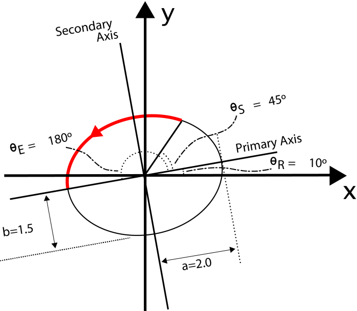 Sweep Angle = tE - tS = arctan((a/b)*tan(thetaE)) - tS = arctan((2.0/1.5)*tan(180)) - tS = 180.0 - tS = 180.0 - 53.130102354155978703144387440907 = 126.86989764584402129685561255909