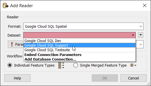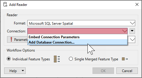 For example, when adding a Microsoft SQL Server Spatial reader, in the drop-down menu of the Dataset field, select Add Database Connection. (For file-based datasets, you must first choose Select Database Connection from the drop-down, then select Add Database Connection from the Connection drop-down in the Select Database Connection dialog.)