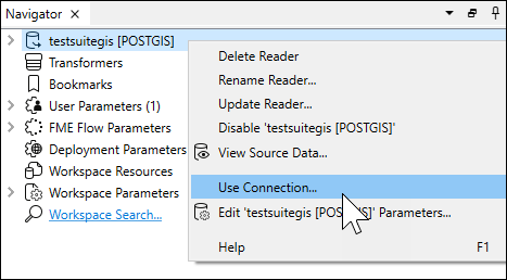 - If the object that is using the connection is a reader or writer, right click on the reader or writer in the Navigator, and select Use Connection.