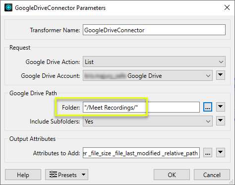 In this GoogleDriveConnector example, Meet Recordings was selected for the Folder parameter: