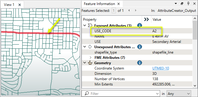 In this example, we will create one new attribute, and assign its value based on another value. The original data contains streets with two attributes. They are routed into an AttributeCreator.
