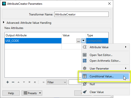 Six Test Conditions have been created, assigning a code to the new attribute USE_CODE, based on the value of the existing attribute USE. If a USE value is found that does match any of these tests, it will receive the USE_CODE value UN.