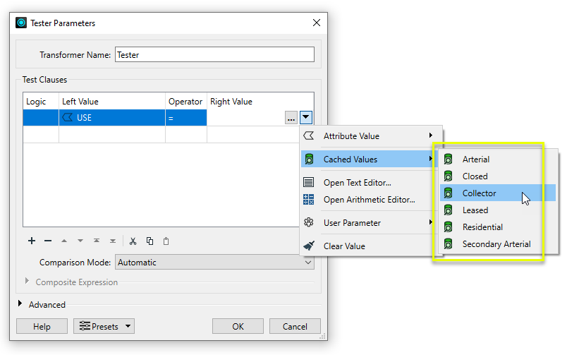 As shown here in the Tester, if the Left Value has been set to an Attribute Value and the features have been cached, the context menu provides access to the values available in those features. If there are only a few choices, they will be presented in a sub-menu.