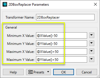 Replaces feature geometry with a 2D box defined by specified minimum and maximum x and y values. |