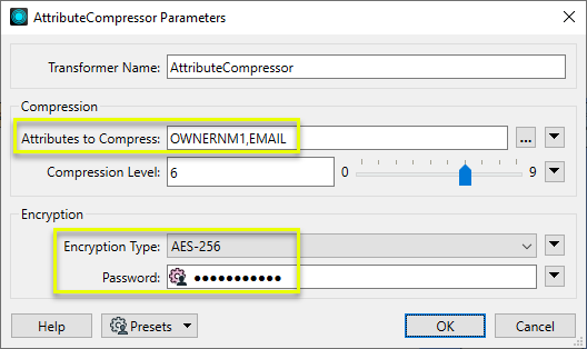 The AttributeCompressor lets you pick one, some, or all attributes to be compressed, and select the level of compression to apply. You can choose to encrypt the compressed attributes with a user-provided password, or leave them unencrypted.