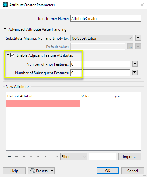 If the Number of Prior Features and Number of Subsequent Features parameters are both set to 2, then when the first feature is read, the AttributeCreator has access to the following features:
