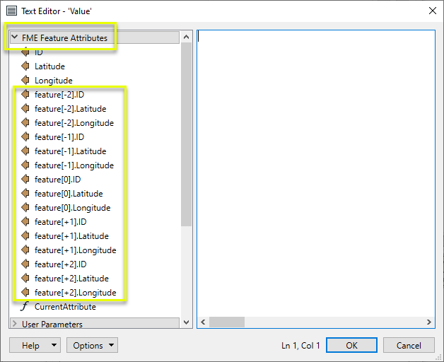 Calculations referencing adjacent features can be created in the Arithmetic Editor and the Text Editor. These editors will list the attributes of the currently processed feature first, then the prior features, then the subsequent features.