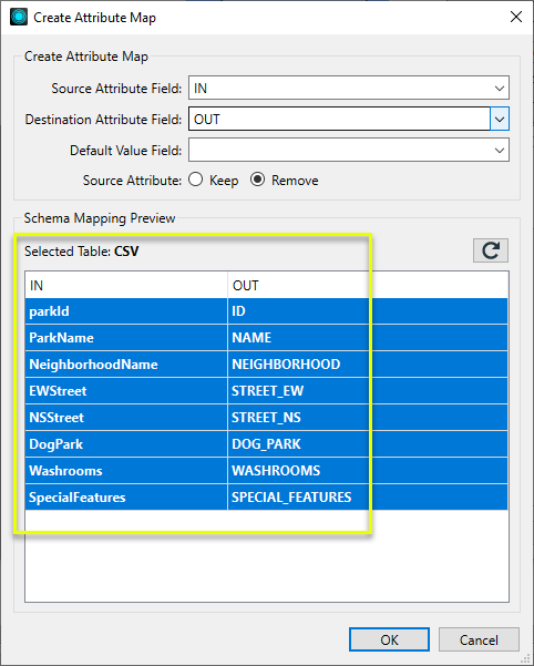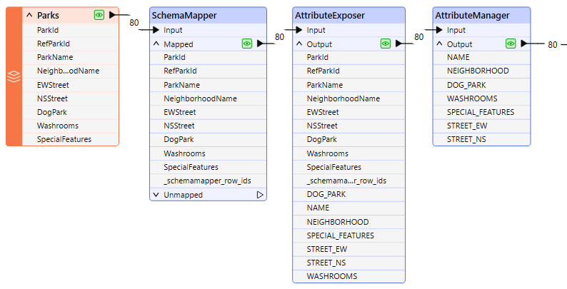 In this example, we have a Parks dataset, and want to change the attribute names to match a desired schema. We route the Parks features into a SchemaMapper, which uses an external CSV file (lookup table) to map the attribute names to new ones.