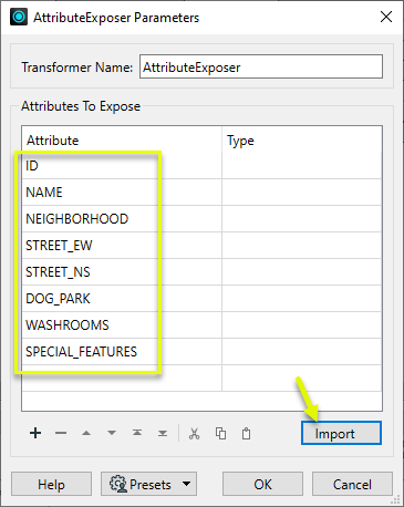 In the AttributeExposer parameters dialog, we add the names of the attributes we want to expose for use elsewhere in the workspace. The names could be entered manually, selected from the drop-down if Feature Caching is turned on, or imported using the Import button and reading the names from the same CSV file used in the SchemaMapper.