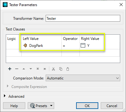 In the parameters dialog of the Tester, we create one Test Clause, looking for DogPark = Y.