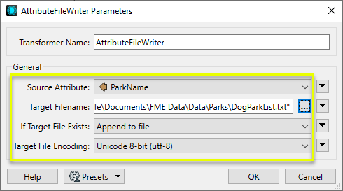 The final step is to write the text file. In the parameters dialog of the AttributeFileWriter, we choose the ParkName attribute and set a Target Filename.