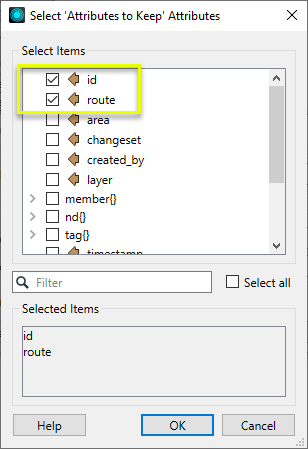 After the AttributeKeeper is connected, click the browse button to display the list dialog. Select the attributes that you want to keep on the feature. The unchecked attributes will be removed, except for any FME attributes. Format attributes will be removed, whether exposed or not. |