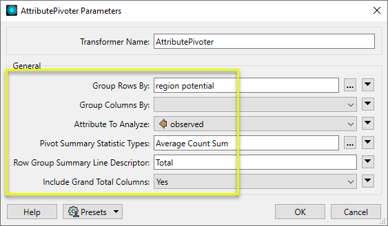 Like the StatisticsCalculator, the AttributePivoter groups features according to selected attributes, and computes statistics on a single attribute for all features in each group (Grouping by rows). Beyond this, the AttributePivoter allows for the order of these row grouping attributes to be specified so that a logical nesting of additional summary rows can be generated. In addition, the AttributePivoter also allows for new attributes to be generated dynamically based on the unique values of a selected attribute (Grouping by Column) with values populated by statistics performed on the resultant groupings.