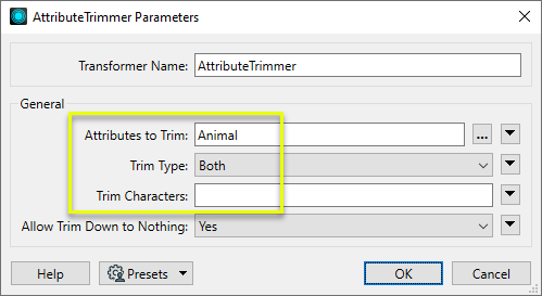 In the Parameters dialog, we select the attribute Animal for trimming, choose Trim Type Both to trim both the left and right-hand sides of the values, and leave the Trim Characters field blank - indicating we want white space removal.