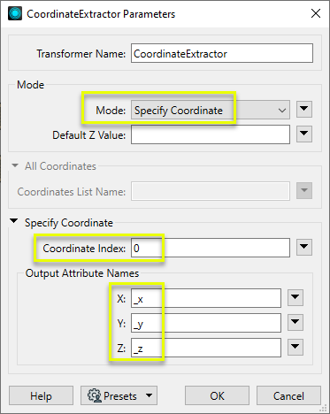 In the parameters dialog, Mode is set to Specify Coordinate. The Coordinate Index default is zero (0), the first one, which is correct. Default names are also provided for the X, Y, and Z output attributes.