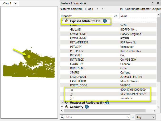 The output features have added attributes - _x, _y, and _z. Note that the coordinate values are in meters due to the UTM coordinate system.