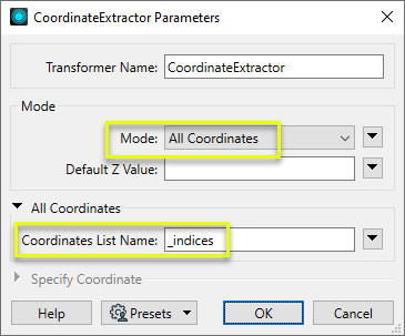 In the parameters dialog, Mode is set to All Coordinates. A default name is provided for the Coordinates List Name - _indices.