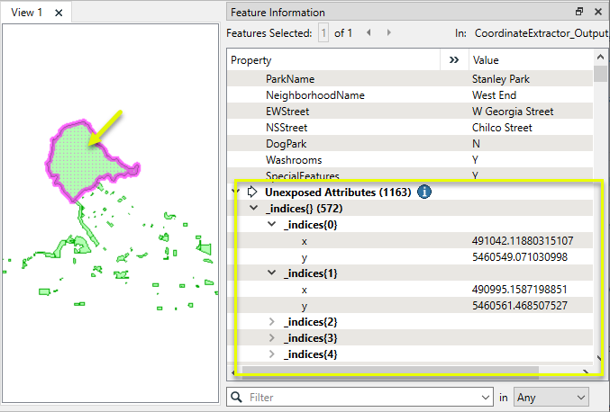 If the input feature is a raster or point cloud, All Coordinates will return its extents, and Specify Coordinate will return the requested vertex on the bounding box (0, 1, 2, 3, 4). If the input feature is multi-part or aggregate, each part’s coordinates are indexed sequentially.
