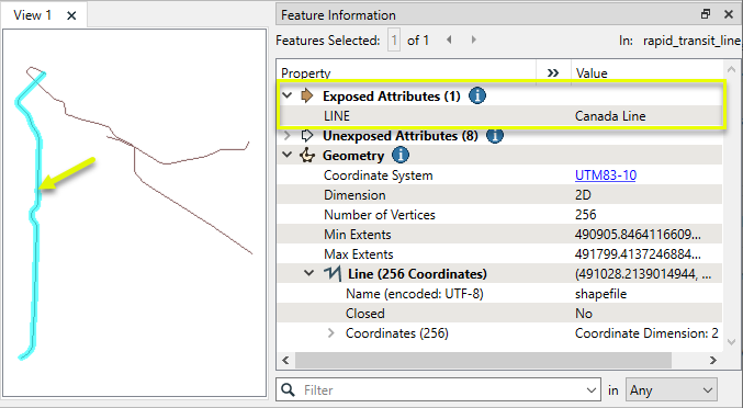 In this example, we want to retrieve the coordinates of the first and last points of these transit lines. Note that the original features have nine attributes.