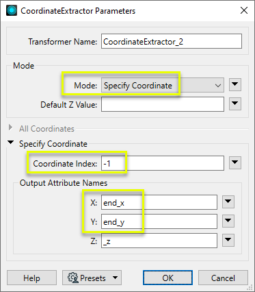 If Specify Coordinate is used, retrieving only one coordinate, the coordinate is identified by its Coordinate Index, which may be either entered as an integer or specified with an attribute value, expression, user parameter, or conditional value. A coordinate index always starts at zero (0). 0 indicates the first vertex (or only vertex of a point geometry), and a negative index can be used to indicate position relative to the last vertex where -1 is the last coordinate, -2 is the second-to-last, and so on. If the index number is invalid, the feature will be rejected.