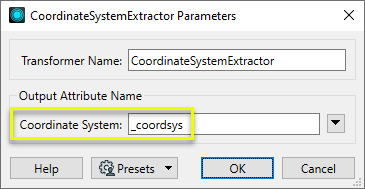 In the parameters dialog of the CoordinateSystemExtractor, the default name for the new attribute to contain the coordinate system information is _coordsys.