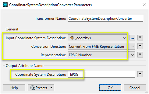 In the parameters dialog of the CoordinateSystemDescriptionConverter, we identify the new _coordsys attribute, choose Convert From FME Representation, select EPSG Number as the destination representation, and edit the new attribute name which will hold the results.