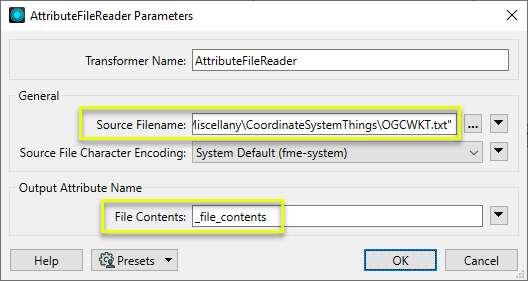 The feature is sent to a CoordinateSystemDescriptionConverter. In the parameters dialog,we set the source to the newly added _file_contents attribute, Convert To FME Representation, choose OGC WKT, and keep the default new attribute name of _newcoordsys.